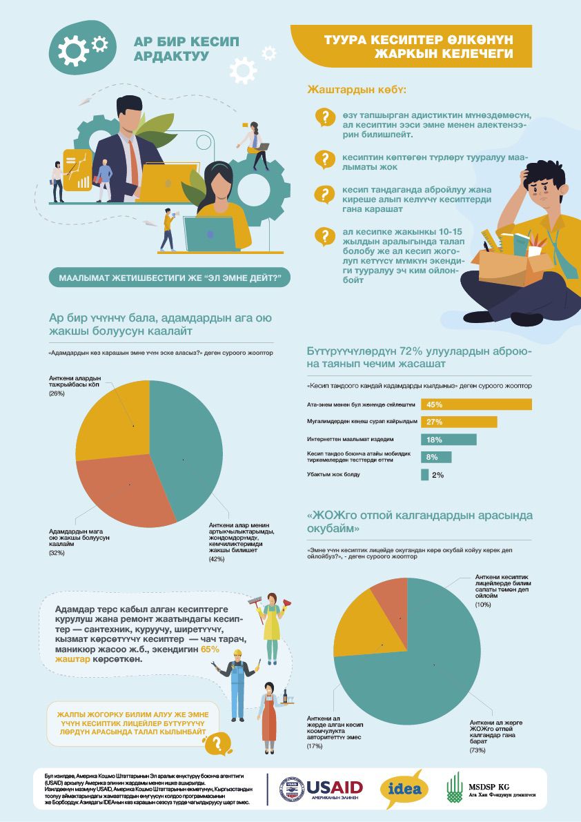 Жаштардын көбү тапшырып жаткан адистиктин мүнөздөмөсүн, ал кесиптин ээси эмне менен алектенерин билишпейт. Анткени, аларда кесиптин көп түрдүүлүгү боюнча маалымат жок. Жыйынтыгында, алар кесип тандап жатып абройлуу жана киреше алып келүүчү кесиптерге басым жасашат. А чындыгында, ал кесипке жакынкы 10-15 жылда талап болобу же ал кесип жоголуп кетиши мүмкүнбү — эч ким ойлонбойт.