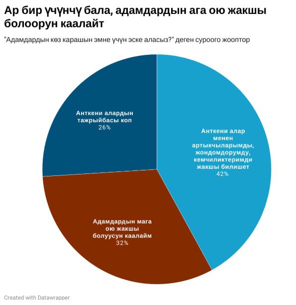 Жаштар башкалардын көз караш, кеңештерин эске алышат — мындай пикирдегилер респонденттердин 65 пайызын түздү. Мындай мамиленин себебине үңүлсөк, анда ар бир үчүнчү бала ага адамдардын ою жакшы болушун каалайт.